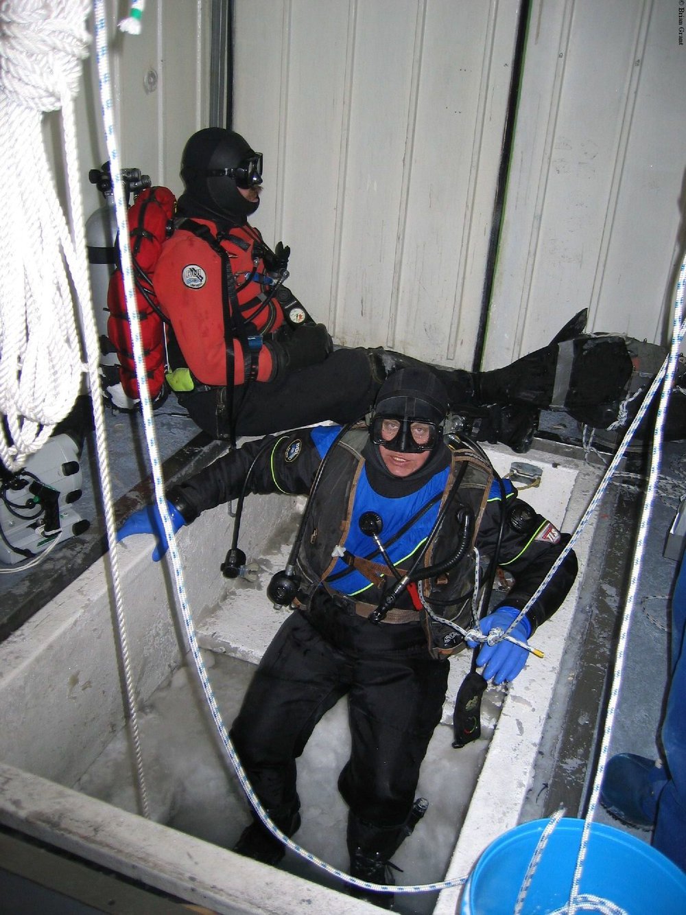 Professor Michael Lesser and Brian Grant preparing to dive at Cape Evans in the New Zealand dive hut (NZ14).. Antarctica NZ, accessed 24/03/2026, https://adam.antarcticanz.govt.nz/nodes/view/30813
