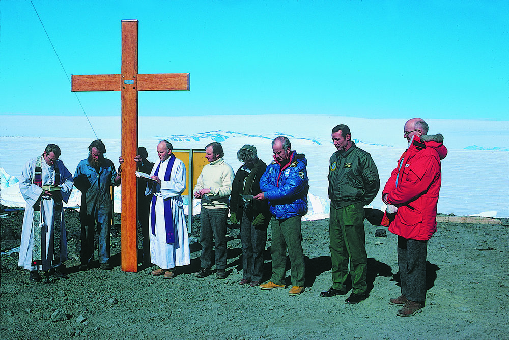 Mt Erebus disaster: plane crash 28 November 1979: Air New Zealand Flight TE901: DC-10. Dedication of the Erebus memorial cross 2 December 1979: left to right:US Navy Chaplain, Garth Varcoe, Bob Dunnachie (obscured); Father Creagh, Mike Prebble, unknown (probably Anne Martindell, US Ambassador), Bob Thomson, Captain Westbrook, unknown (proba