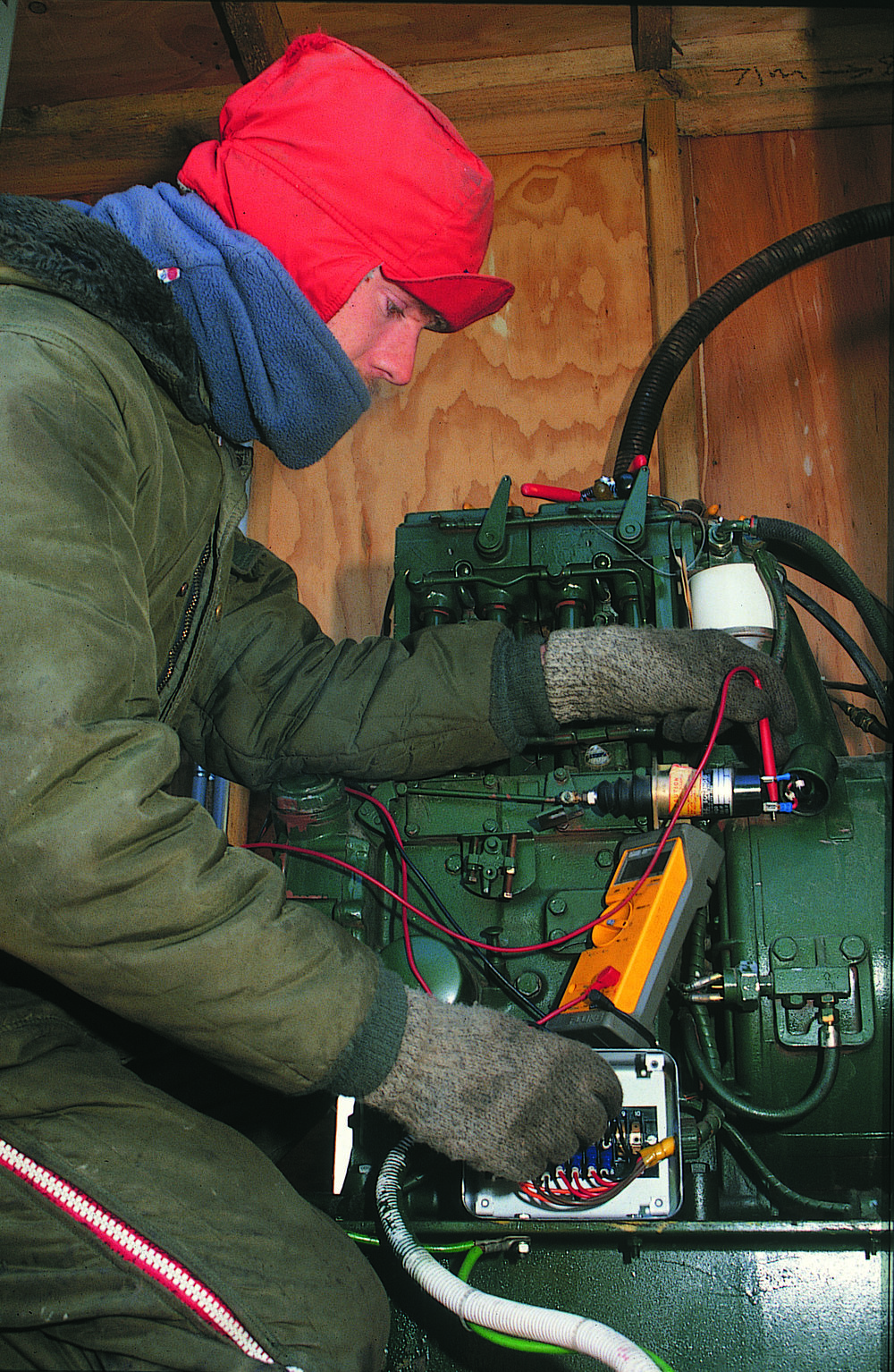 Bruce Calder w/o electrician fixing engine in unheated hut