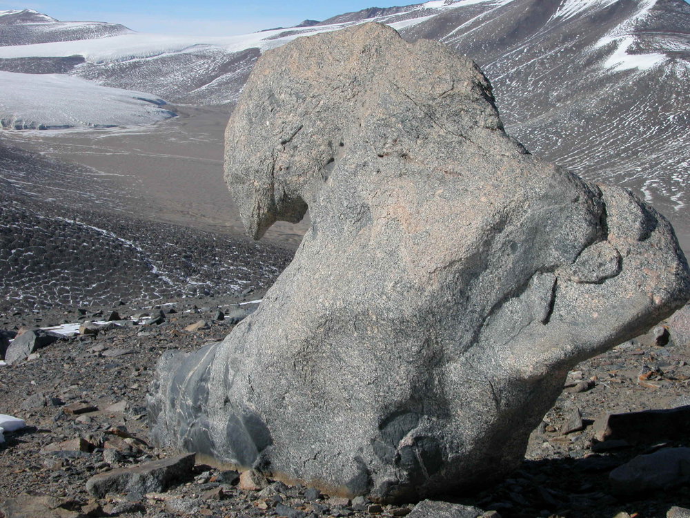 Sculpture of weathered granite with Victoria Lower Glacier in background. Antarctica NZ, accessed 05/04/2026, https://adam.antarcticanz.govt.nz/nodes/view/31293