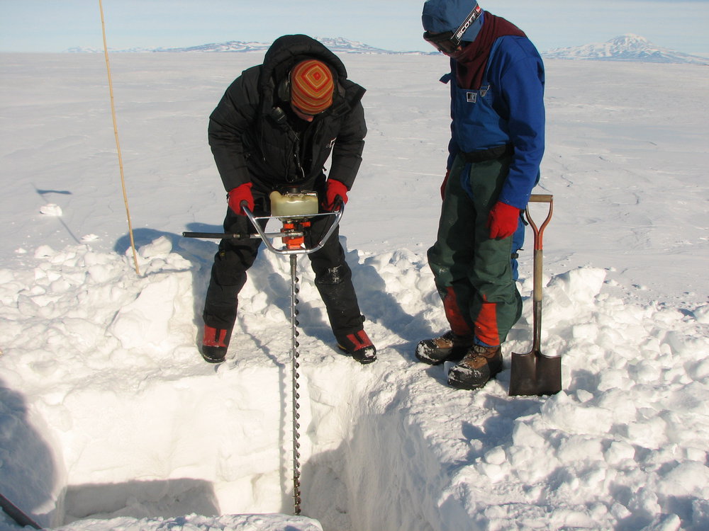 Simon drilling the sea ice with the "Jiffy" drill