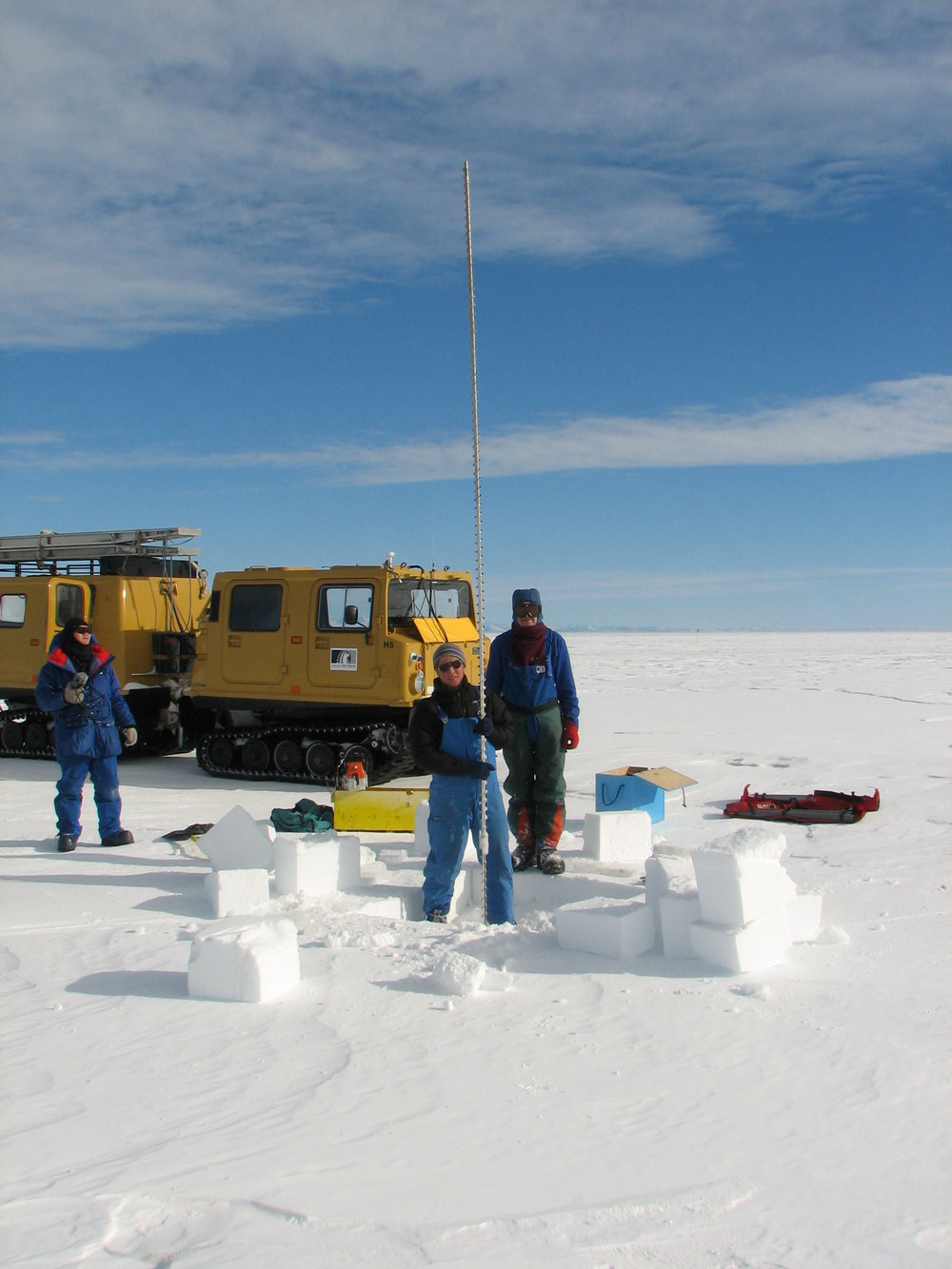 Mark holding up the drill to record the thickness of the sea ice at site 4. Antarctica NZ, accessed 09/04/2026, https://adam.antarcticanz.govt.nz/nodes/view/31474