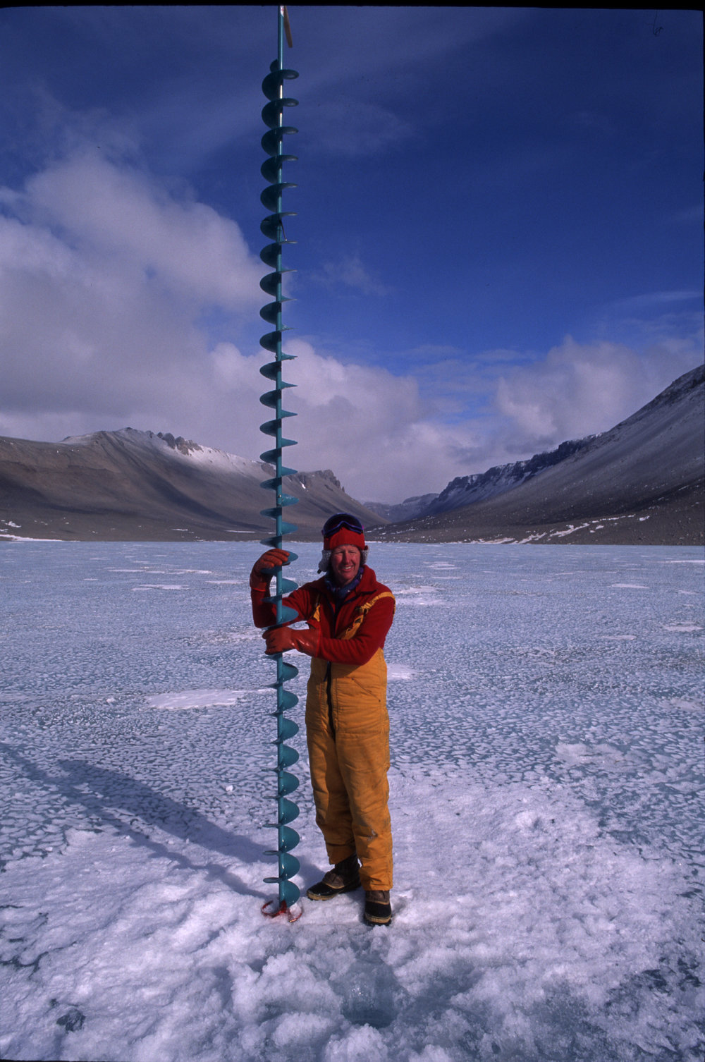 Clive Howard-Williams shows the ice cap depth of Lake Vanda
