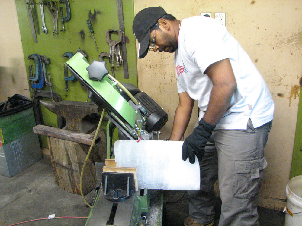 Mohan cutting the sea ice samples back at Scott Base