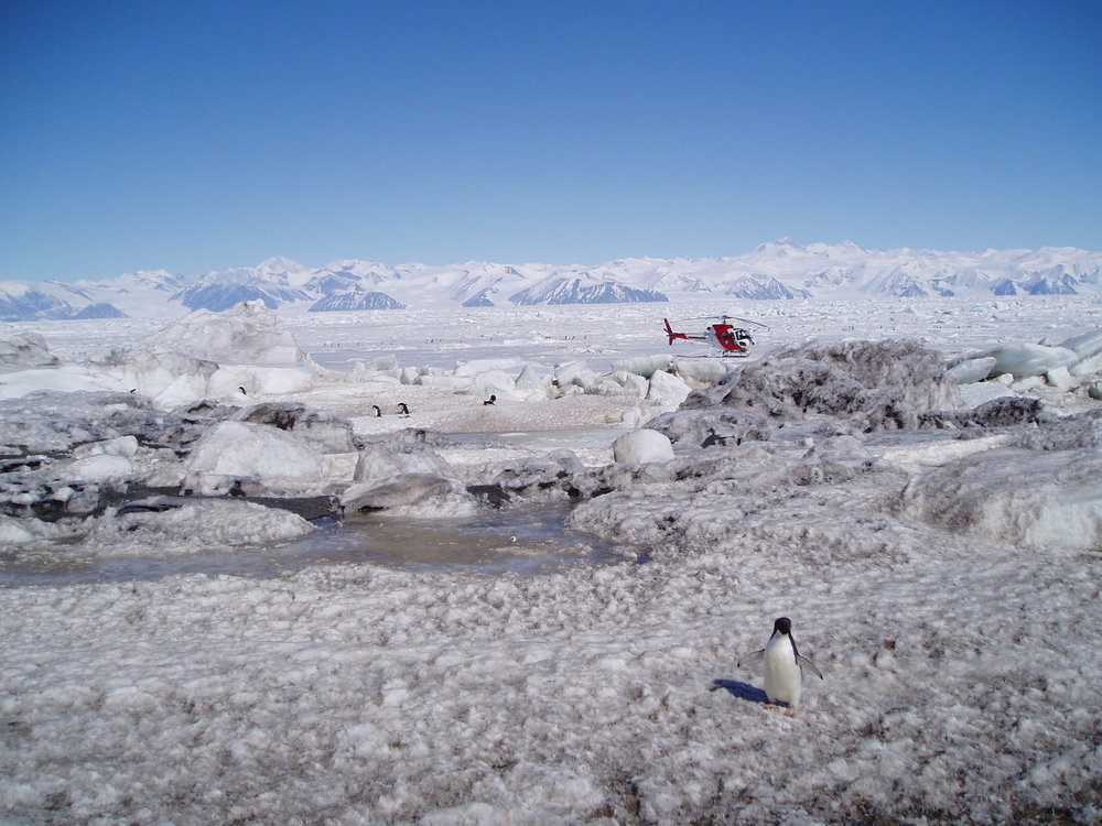 various items in the landscape; boat, historic hut (Borchgrevink), iron, penguin with egg