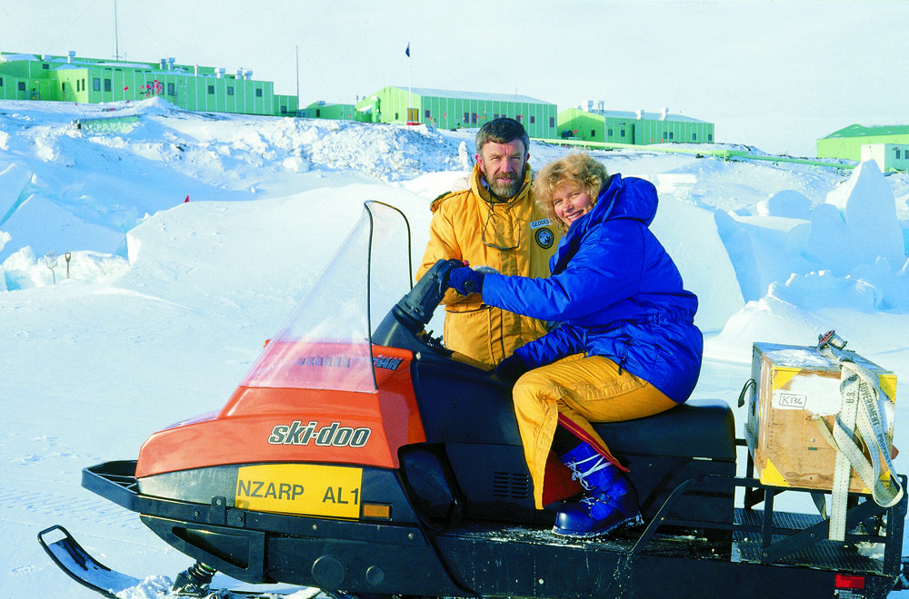 Christchurch mayor 1989-1998, Vicki Buck, with Scott Base manager Dave Geddes on a skidoo in front of Scott Base in 1990. Antarctica NZ, accessed 24/03/2026, https://adam.antarcticanz.govt.nz/nodes/view/31884