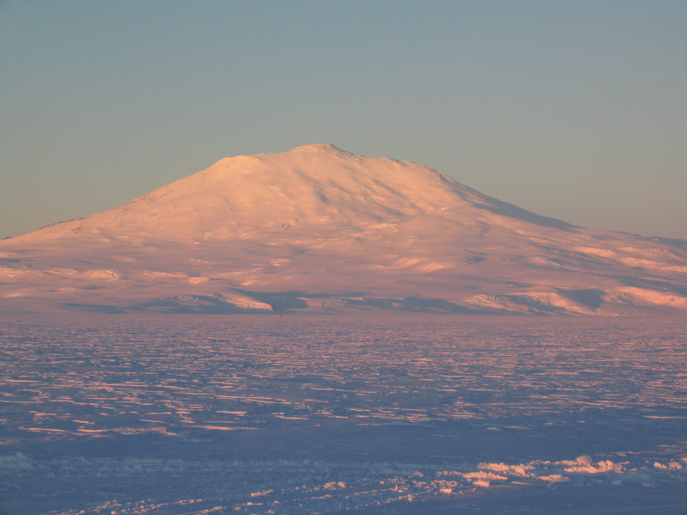 Mt Erebus in low, pink light