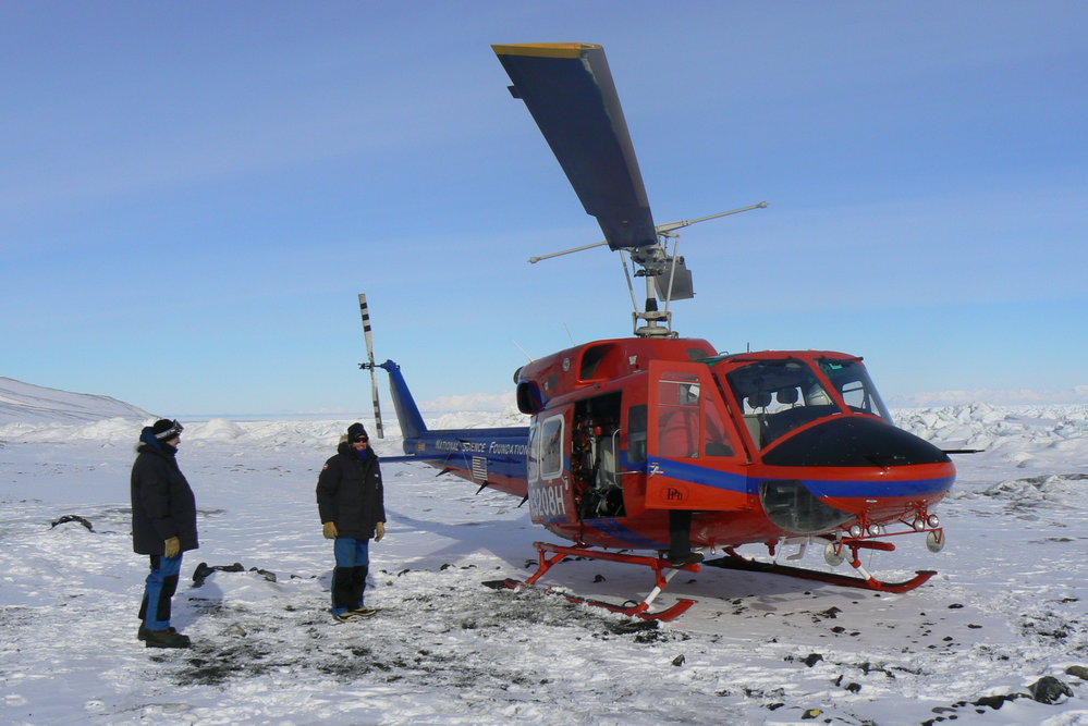 Tim Hay and Graham McElroy with US helicopter at Cape Bird