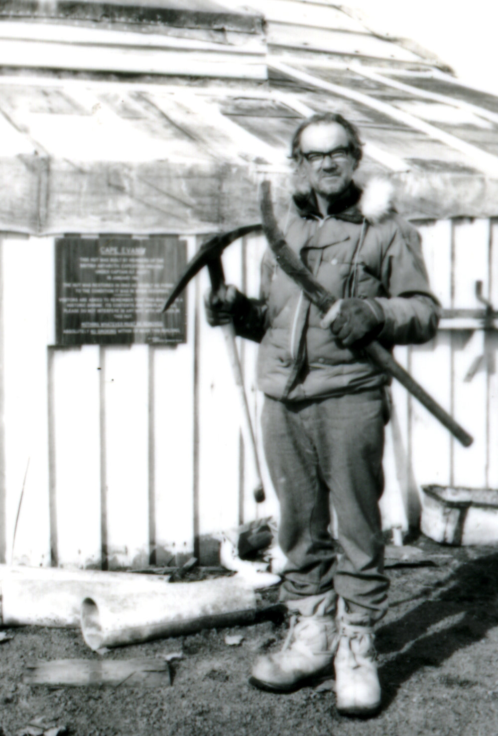 DescriptionHut caretaker, Albie Burton with new finds at Scott's Cape Evans hutDepictsAlbie BurtonPhotographerNeville PeatSeason1976-1977LocationCape Evans