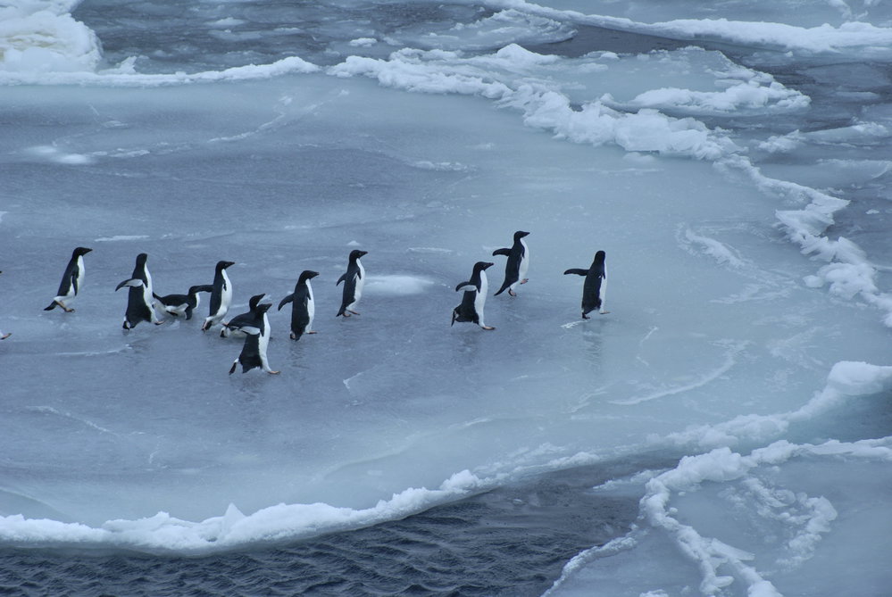 Adelie penguins on a newly formed ice floe, northern Ross Sea