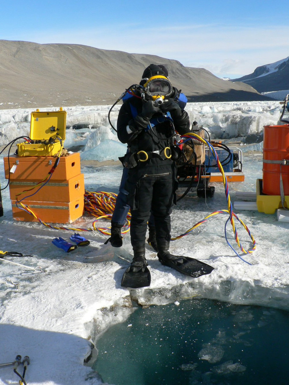 Diver ready to enter the dive hole at Lake Hoare, McMurdo Dry Valleys. Antarctica NZ, accessed 09/04/2026, https://adam.antarcticanz.govt.nz/nodes/view/32588