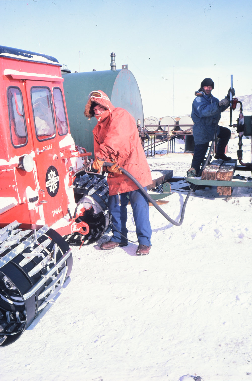 DescriptionRefuelling the Snowmaster at Scott BaseDepictsArthur StoneKerry Kirkness PhotographerKim WesterskovSeason1982-1983Date Taken1982-1983 SeasonOriginalSlideNo. People2-5LocationScott BaseGeolocation[1] Position
