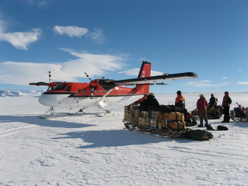 Twin Otter, supplies and sleds at Roadend Nunatak