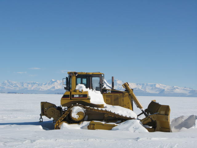 CAT (Caterpillar) bulldozer covered in snow with mountains behind