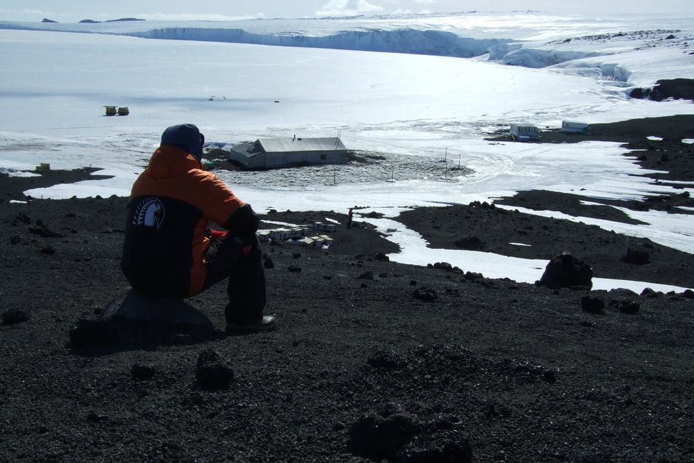 Person looking down to Cape Evans hut and the Barne Glacier