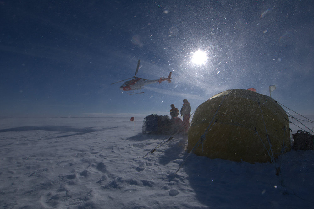 Helicopters NZ helo departing the south Drygalski camp based around the Endura tent over a sea ice hydrohole.. Antarctica NZ, accessed 04/04/2026, https://adam.antarcticanz.govt.nz/nodes/view/32943