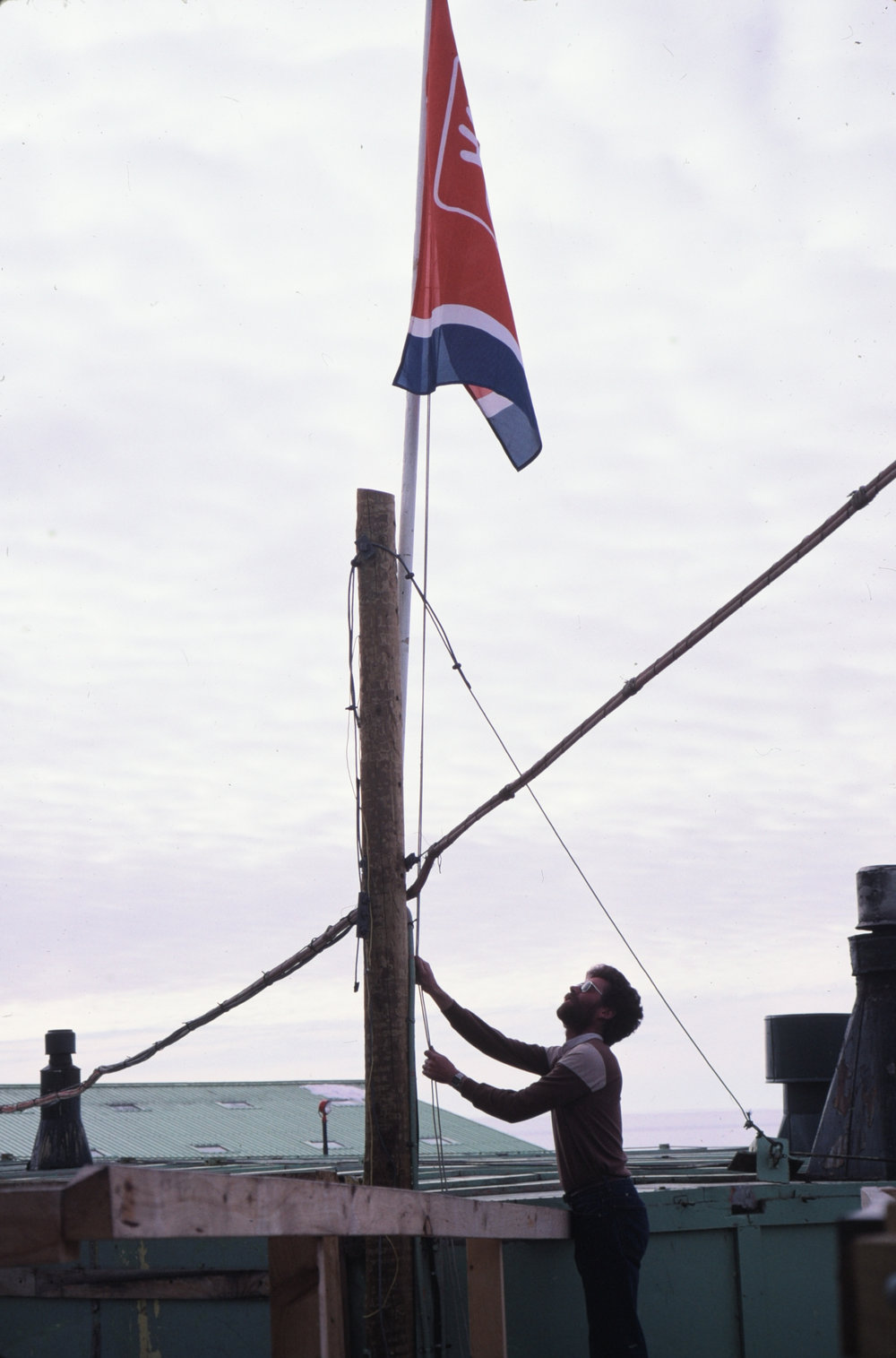 DescriptionPaul Purves raising the Post Office flagDepictsPaul Purves PhotographerLinda HarrisonSeason1985-1986Date TakenBetween 1st November 1985 and 30th November 1985OriginalSlideNo. People1LocationScott BaseGeolocation[1] Position