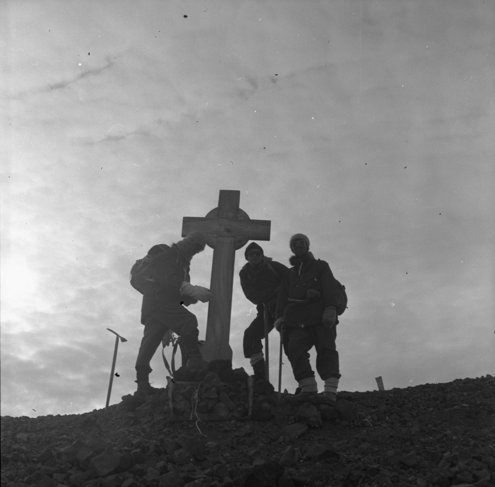 DescriptionVince's Cross at Hut Point. From Left: E. Gawn, A. Edwards, N. Sandford at Vince's CrossDepictsTed GawnBert EdwardsNeil SandfordProgrammeTrans Antarctic ExpeditionEventTAESeason1957-1959Date Taken1957-1959 SeasonOriginalFilmNo. People2-5LocationHut PointGeolocation[1] Position
