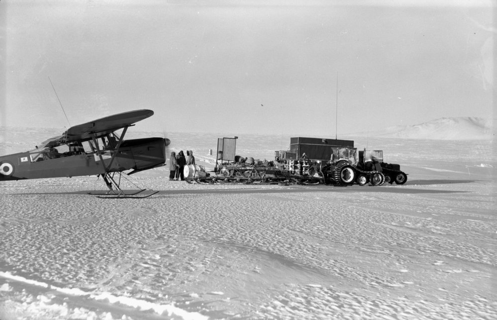 DescriptionAuster aircraft and tractor train at Butter Point.ProgrammeTrans Antarctic ExpeditionEventTAESeason1957-1959Date Taken1957-1959 SeasonOriginalFilmNo. People2-5LocationButter PointGeolocation[1] Position