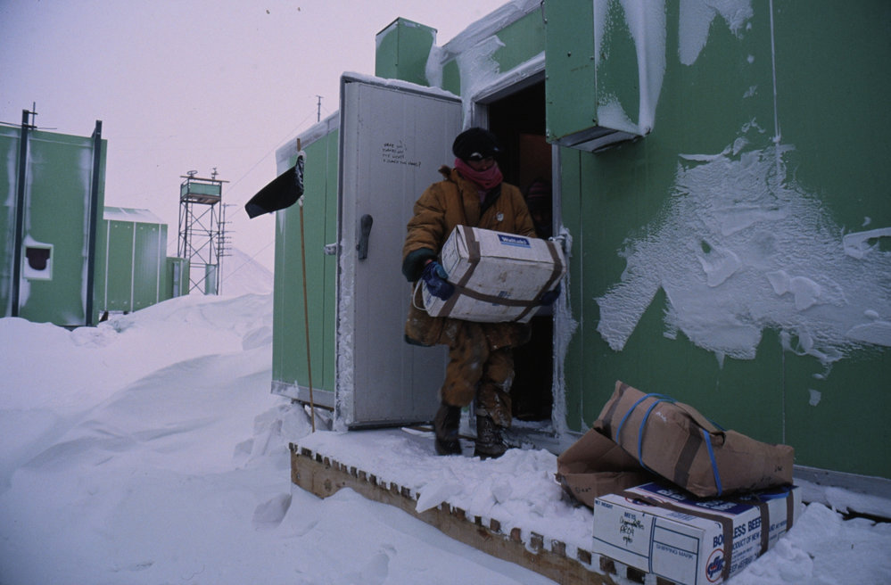 DescriptionTuppence Loe collecting food from the food storeDepictsTuppence Loe PhotographerKim WesterskovSeason1989-1990Date TakenBetween 1st September 1990 and 30th September 1990OriginalSlideNo. People1LocationScott BaseGeolocation[1] Position