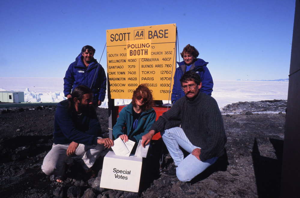 DescriptionVoting at Scott Base in the Wellington By-ElectionPhotographerKevin RandlesSeason1992-1993Date TakenBetween 1st December 1992 and 31st December 1992OriginalSlideNo. People2-5LocationScott BaseGeolocation[1] Position