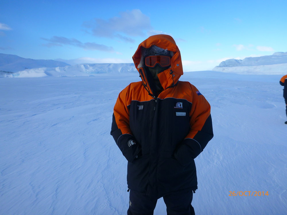 Mike Mahon between the icebergs at Cape Evans