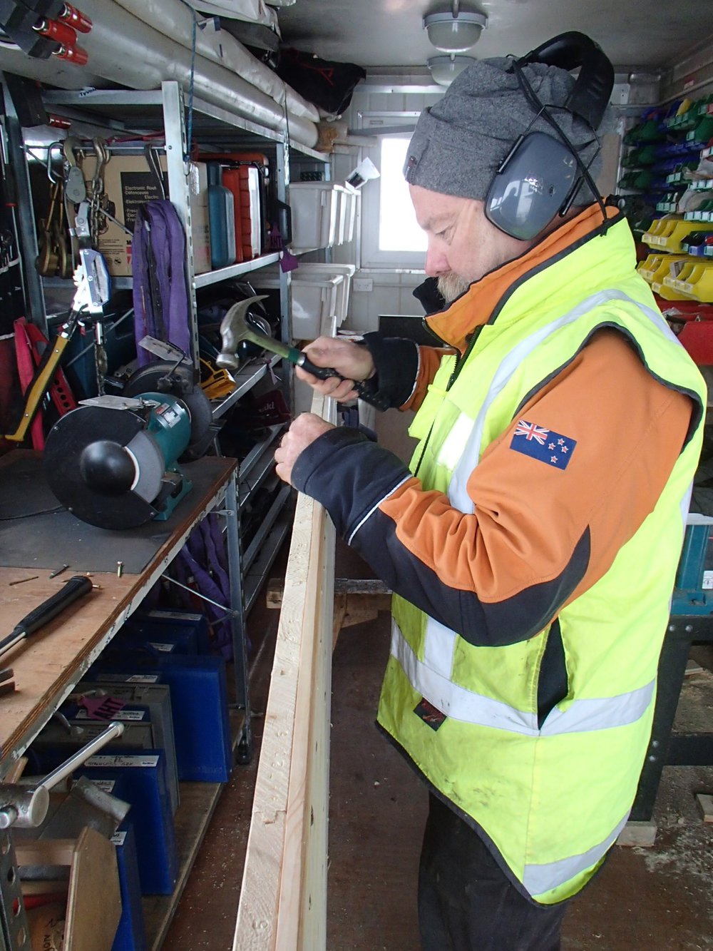 Programme Manager Al Fastier working on conservaiton repairs to Discovery Hut, inside the AHT purpose-built Carpentry Workshop.