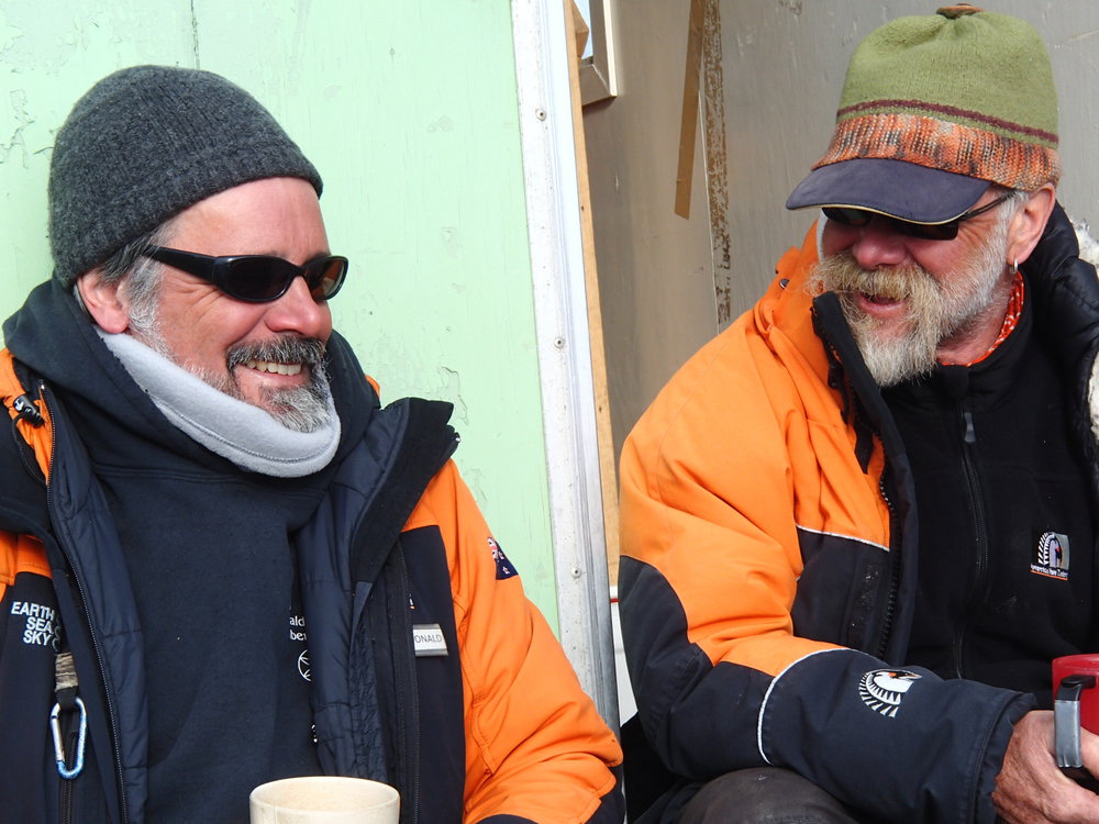 AHT's Lead Carpenter Gord Macdonald and Programme Manager Al Fastier discuss the work programme outside the AntNZ safety wannigan at Cape Royds.