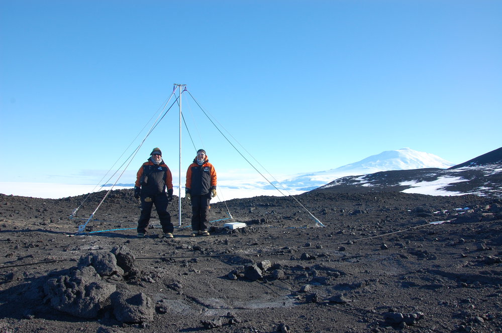 Prof. Craig J. Rodger and Dr. James B. Brundell standing by the nearly repaired AARDDVARK antenna at Arrival Heights, Ross Island, Antarctica.This is located in the Arrival Heights Antarctic Specially Protected Area, which is a "quiet zone" near McMurdo Station and Scott Base [15 Nov 2014].