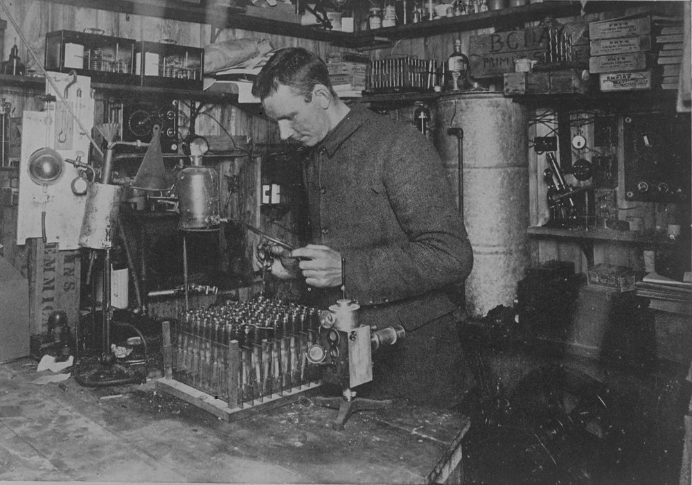George Simpson (meteorologist) in his laboratory, Scott's Hut, Cape Evans 1912-1914