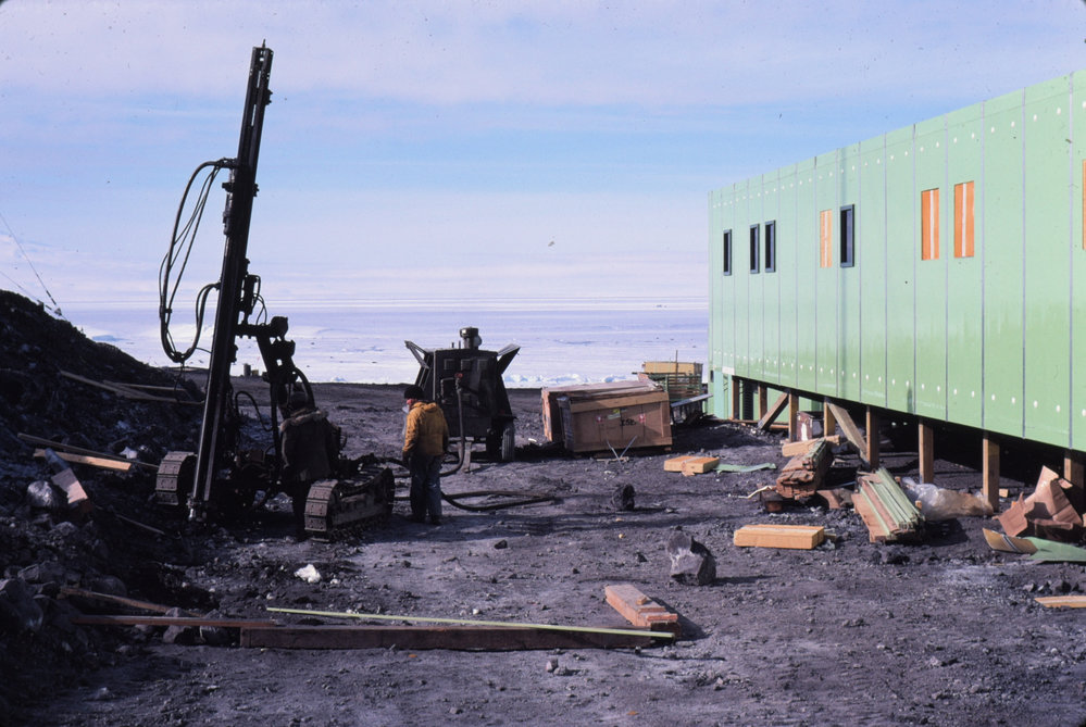 DescriptionDrilling foundation for new freezerPhotographerR ClarkSeason1980-1981Date Taken1980-1981 SeasonOriginalSlideNo. People1LocationScott BaseGeolocation[1] Position