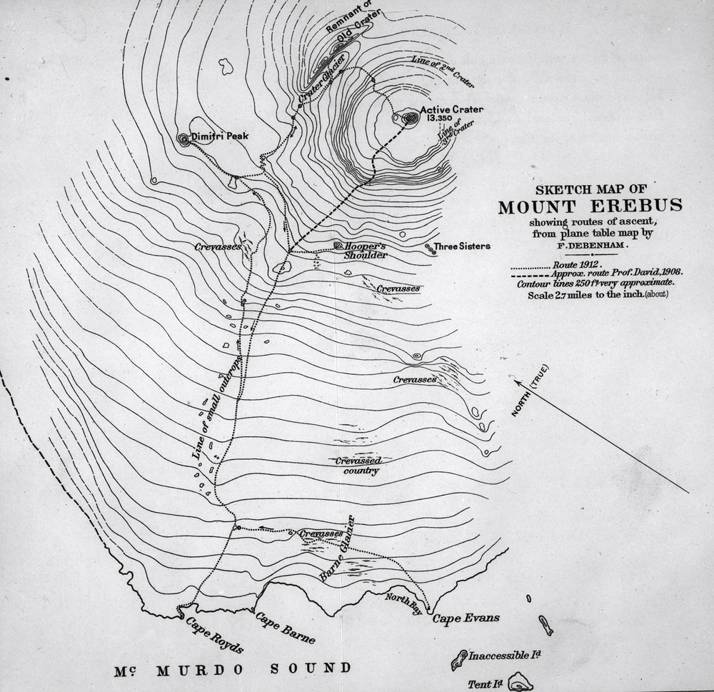 DescriptionSketch map of Mount Erebus showing routs of ascent from a plane table map by Frank DebenhamOriginalGlass PlateLocationMount ErebusGeolocation[1] Position