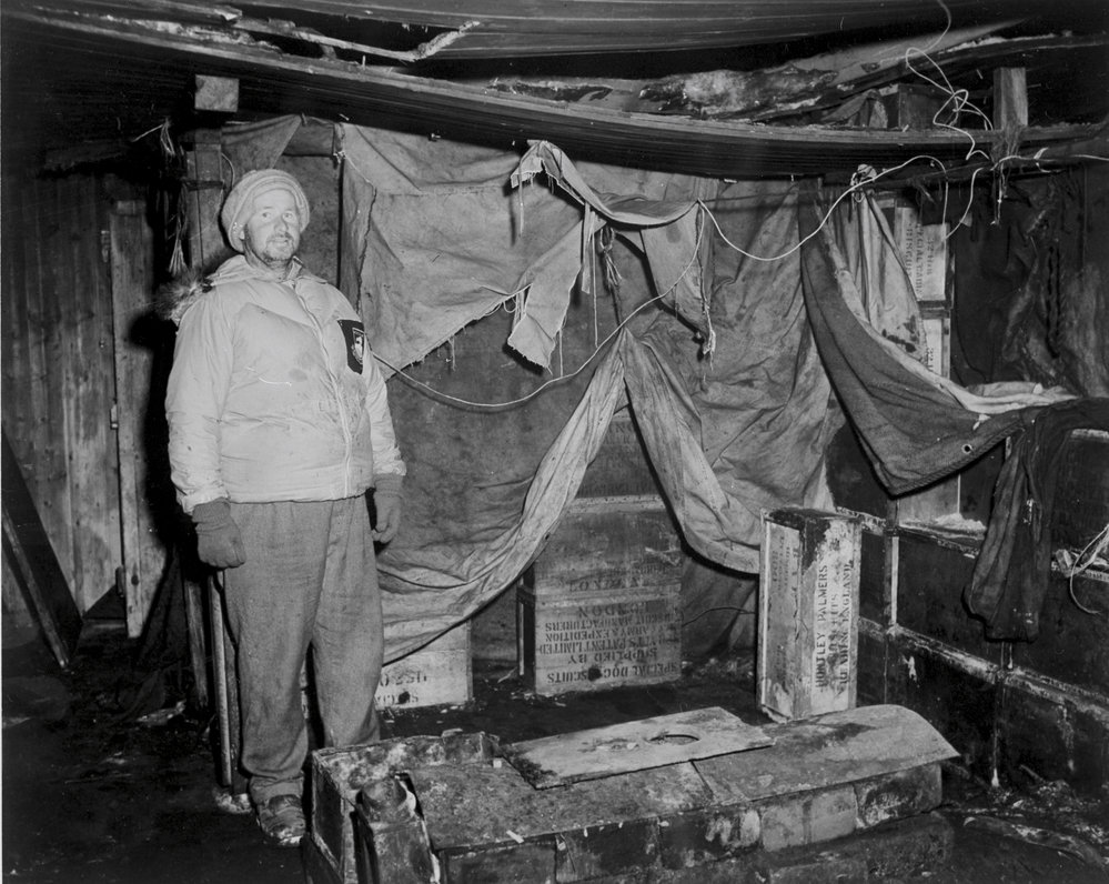 Eric Gibbs Stands Beside an Old Brick Stove. The stove was used to boil down seal fat to make lamp oil