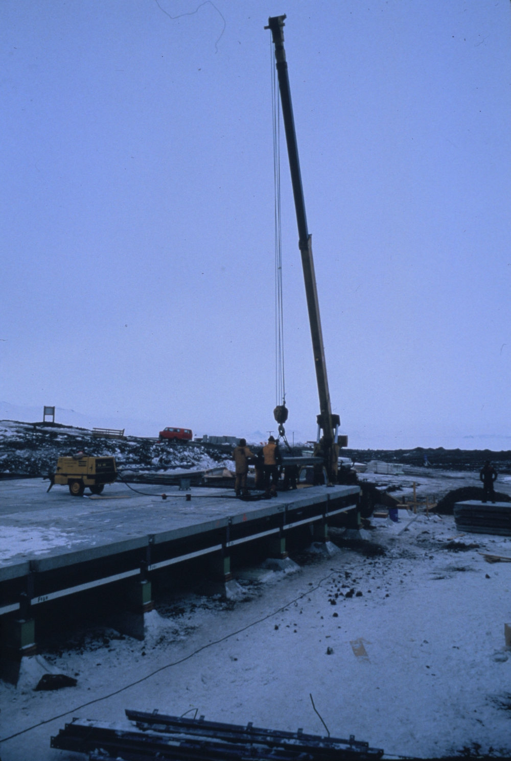 DescriptionConstruction of Stage VII, Scott BasePhotographerGarth VarcoeSeason1986-1987Date Taken1986-1987 SeasonOriginalSlideNo. People2-5LocationScott BaseGeolocation[1] Position