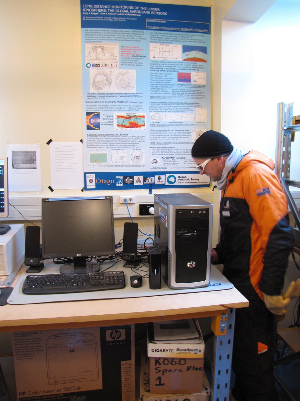 Dr. James Brundell (University of Otago) looks at the K060-AARDDVARK/WWLLN experimental setup inside the New Zealand Arrival Heights lab. This equipment is connected to the VLF mast outside.