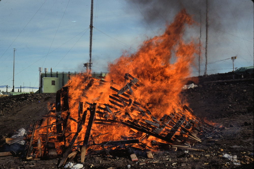DescriptionBurning Old Wood and Rubbish at Scott BasePhotographerNigel S RobertsSeason1979-1980Date Taken1979-1980 SeasonOriginalSlideLocationScott BaseGeolocation[1] Position