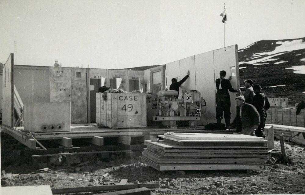 DescriptionAssembling Scott Base - Generator BuildingPhotographerRon MitchellSeason1956-1957Date Taken1956-1957 SeasonOriginalPrintNo. People2-5LocationScott Base