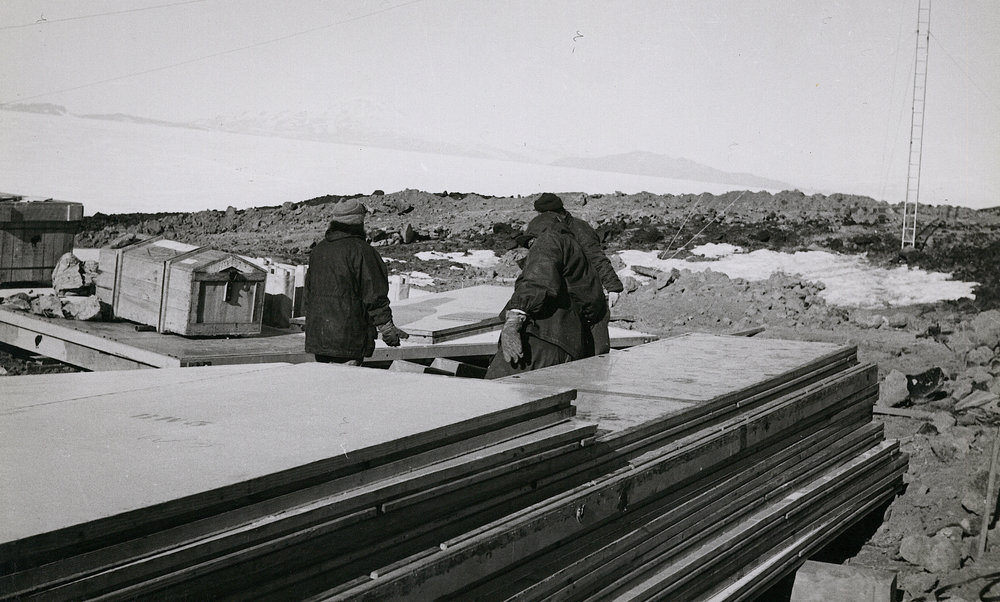 DescriptionScott Base under construction - Roff panel components. 1956-1957PhotographerRon MitchellSeason1956-1957Date Taken1956-1957 Season1956-1957 SeasonOriginalPrintNo. People2-52-5LocationScott BaseScott Base