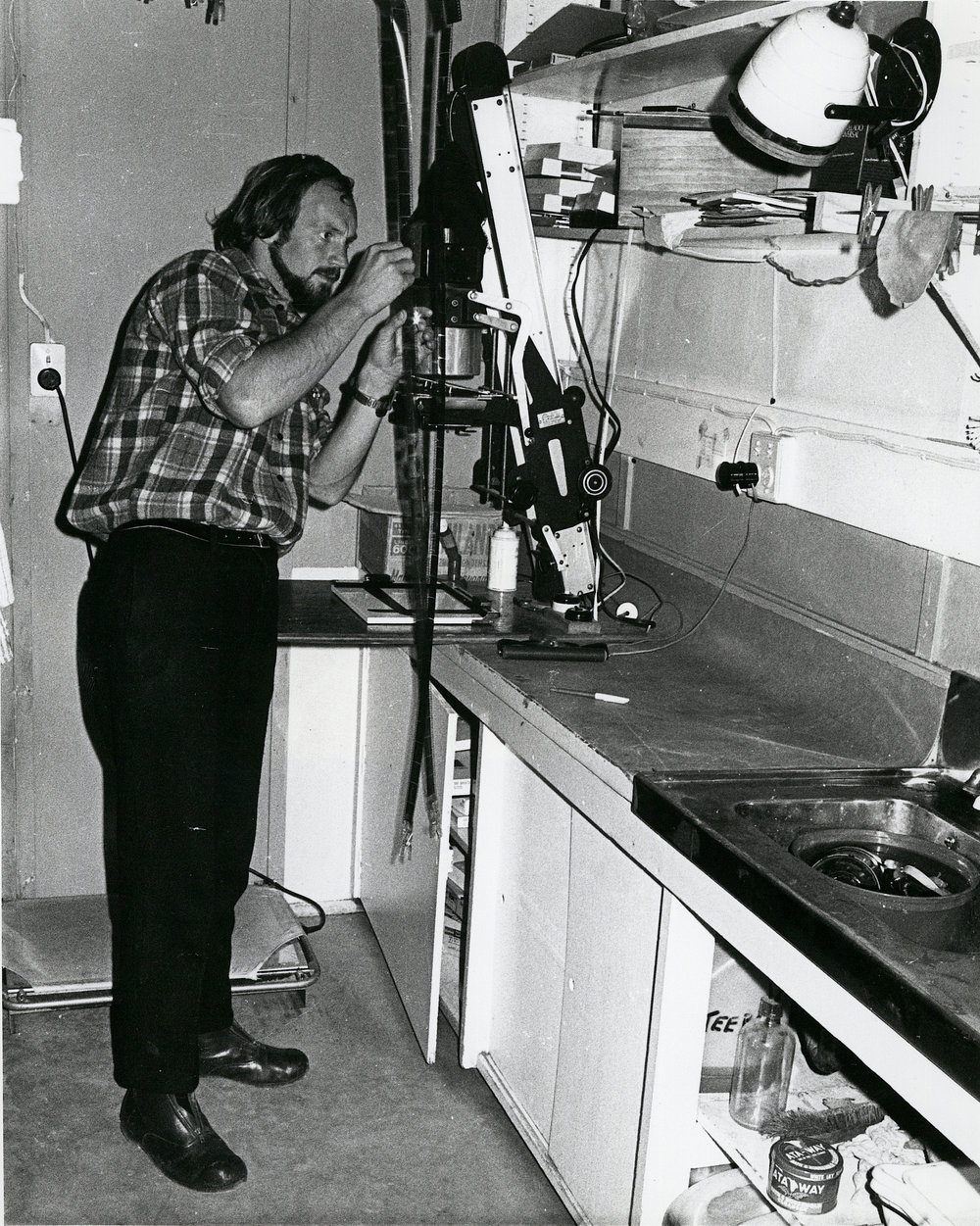 DescriptionScott Base| Neville Peat| in darkroom| B hut| Jan 1977DepictsNeville PeatPhotographerNeville PeatSeason1976-1977Date Taken1976-1977 SeasonOriginalPrintNo. People1LocationScott Base