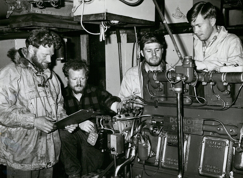 DescriptionScott Base| generator| 'Greasy Group' Bob Wright| Charlie Hough| Brian Judd| brian Dorrington| working in engine room| 1964-1965DepictsBob WrightCharlie HoughBrian JuddBrian DorringtonPhotographerJack CalvertSeason1964-1965Date Taken1964-1965 SeasonOriginalPrintNo. People2-5LocationScott Base