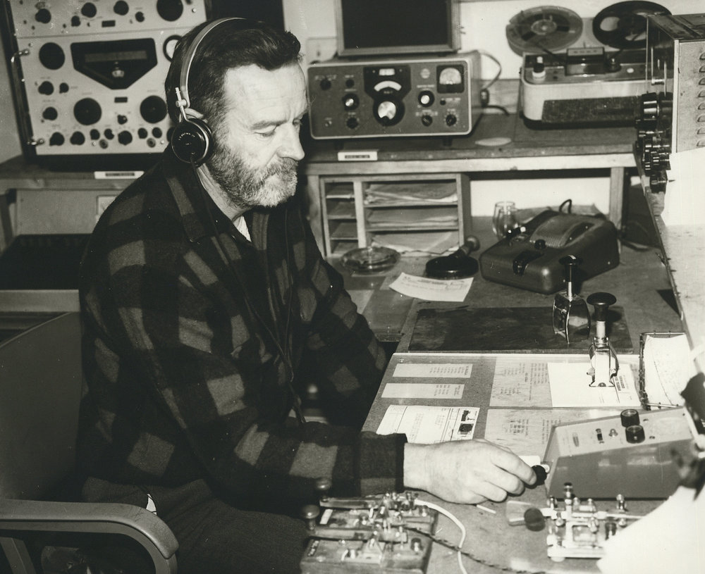 DescriptionAll telegram communications to the outside world are sent by morse| sending out a copy of his afternoon schedule with Wellington is postmaster Neville Copeland| 6/2/73DepictsNeville CopelandPhotographerBruce LaybournDate Taken1973-02-06OriginalPrintNo. People1LocationScott Base