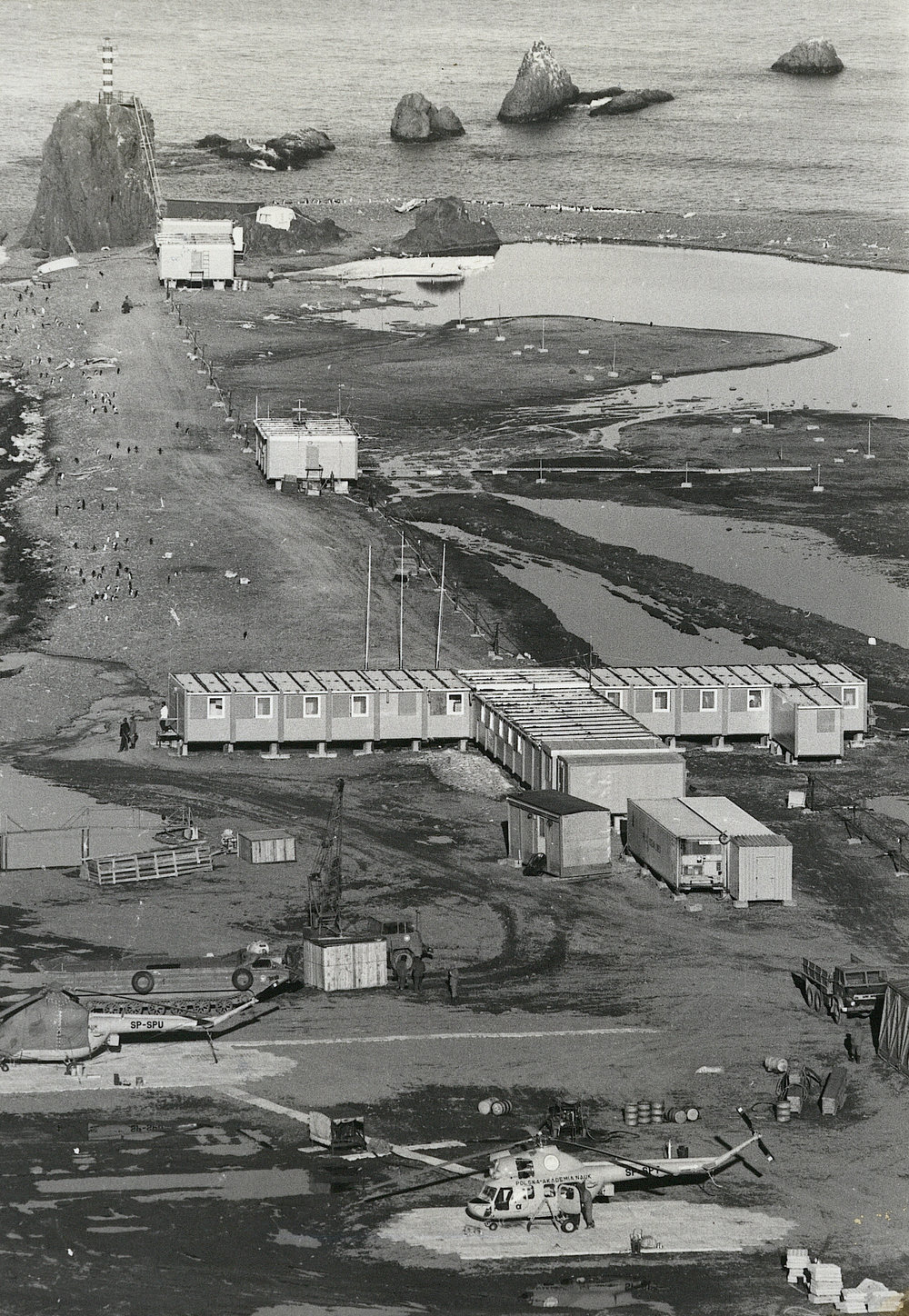 DescriptionPoland Henryk Arctowski Station. First scientific station established in Antarctica during the 1976/77 season. Located at Point Thomas Admiralty Bay, King George Island. South Shetlands. Mi2 Helicopter in foreground.PhotographerRoger WaiteSeason1976-1977Date Taken1976-1977 SeasonOriginalPrintNo. People2-5LocationKing George Island