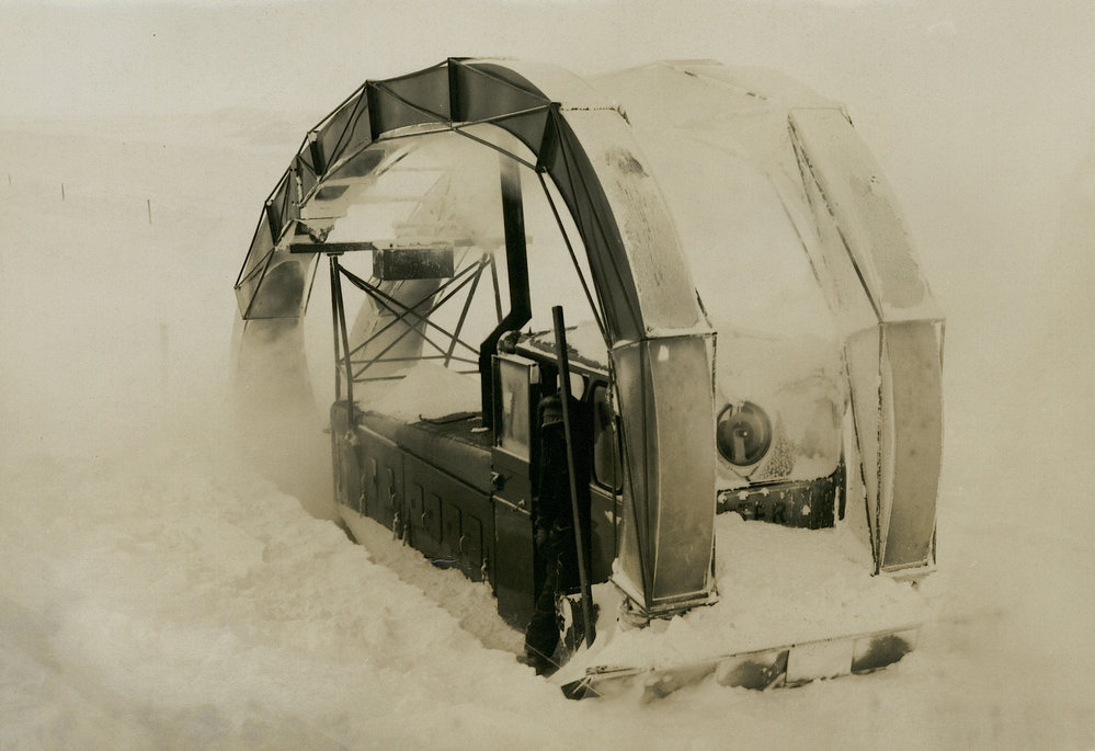 Peter snow miller begins cutting a tunnel in the snow at the nerw Byrd Station, equipped with steel chutes that direct the placement of the snow being cut, the machine lays down snow pads at each side of the tunnel. These Pads act as support for the base of arches that will eventually roof the tunnel.PhotographerL D SayenSeason1961-1962Date Taken1961-1962 SeasonOriginalPrintLocationByrd Station