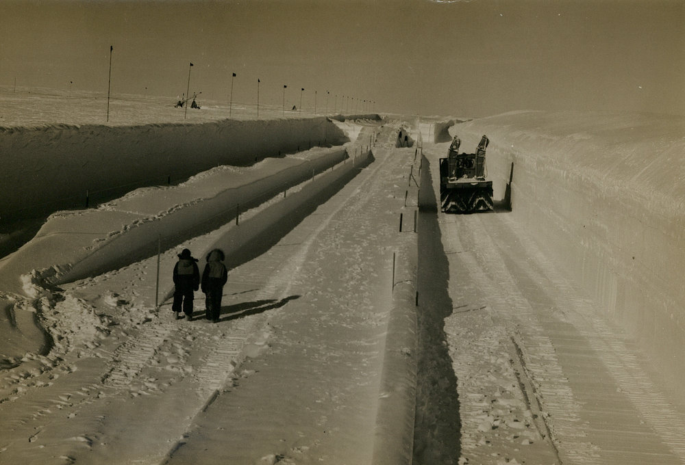 the giant Peter snow miller midway along a tunnel during Operation Deep Freeze 62 at new Byrd Station. This particular stretch later to be roofed with steel arches contains scientific buildingsPhotographerL D SayenSeason1961-1962Date Taken1961-1962 SeasonOriginalPrintNo. People2-5LocationByrd Station