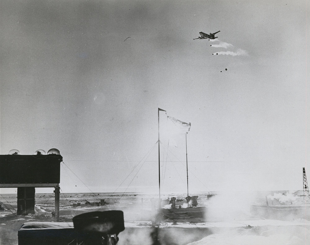 Byrd Station with Airforce C124 Globemaster makes a fuel drop