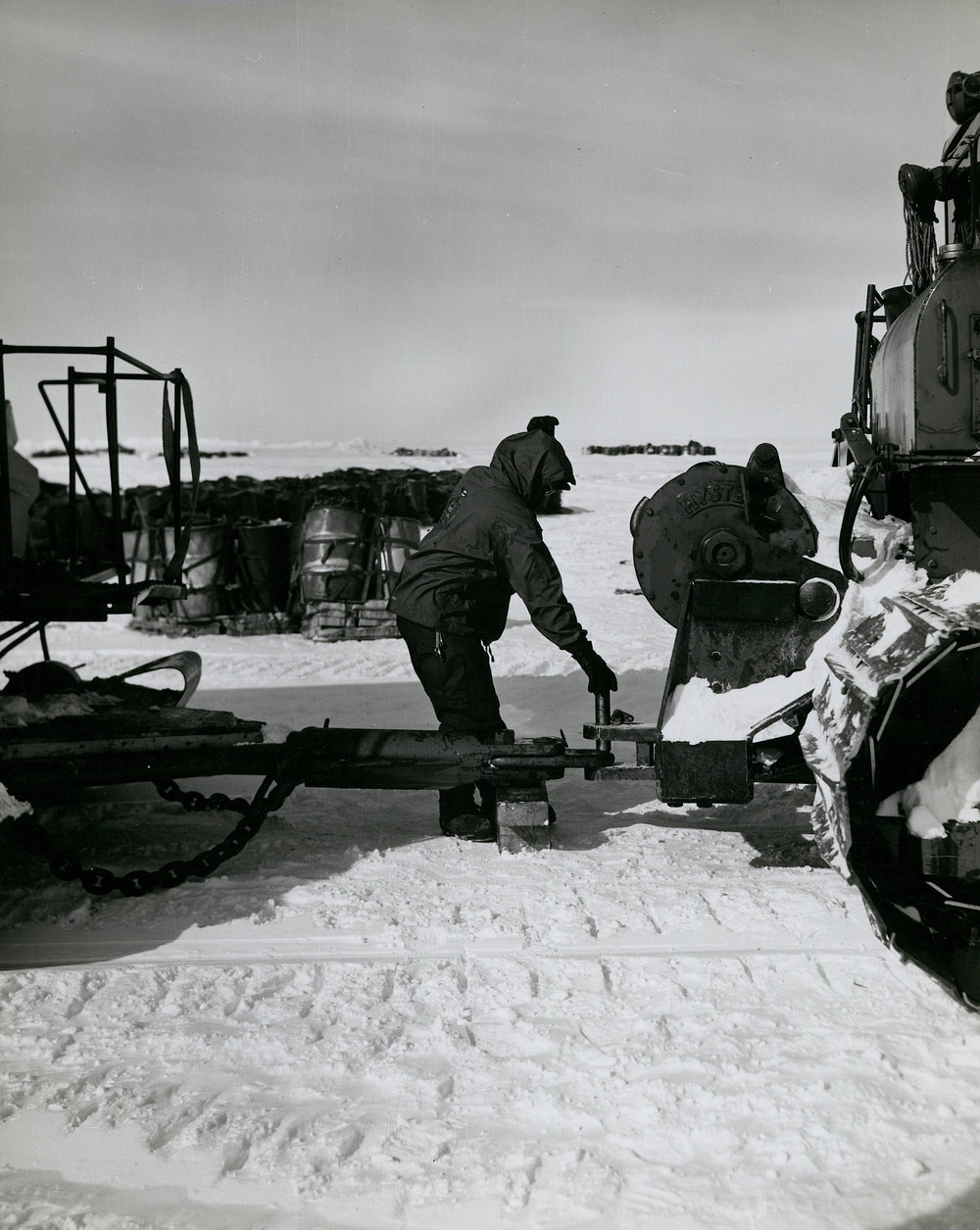 DescriptionHooking a wannigan to a tractorPhotographerW L LewandoskiSeason1960-1961Date Taken1960-1961 SeasonOriginalPrintNo. People2-5LocationByrd Station