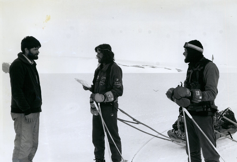 DescriptionReinhold Messner and Arved Fuchs| at the end of their Trans-Antarctic Crossing| with Scott Base's Malcolm Macfarlane| 15/2/90DepictsReinhold MessnerArved FuchsMalcolm MacFarlanePhotographerJosie McNeeDate Taken1990-02-15OriginalPrintNo. People2-5LocationScott Base