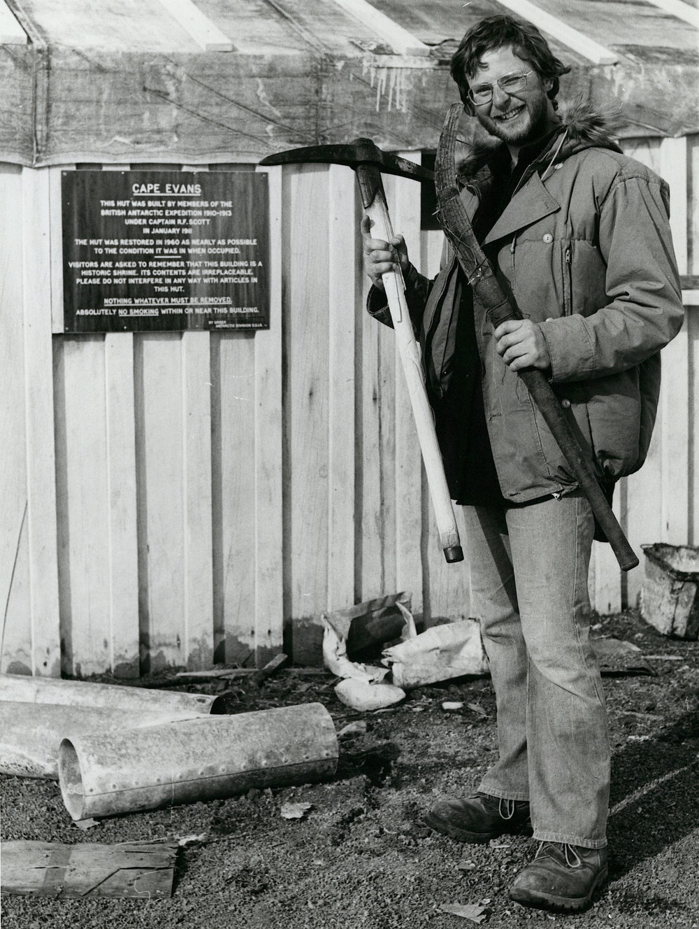 DescriptionCaretaker Jeremy Sutton-Pratt at Scott's Terra Nova HutDepictsJeremy Sutton-PrattPhotographerNeville PeatSeason1976-1977Date TakenBetween 1st January 1977 and 31st January 1977OriginalPrintNo. People1LocationCape Evans