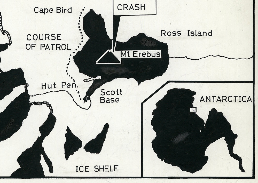 Map identifying DC10 crash site on Mt Erebus