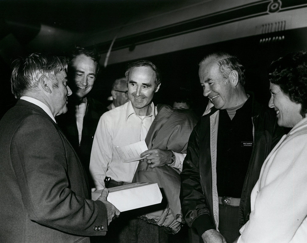 Robert Thomson receives a presentation from Norm McPherson on his 50th flight to Antarctica . Antarctica NZ, accessed 12/04/2026, https://adam.antarcticanz.govt.nz/nodes/view/40601
